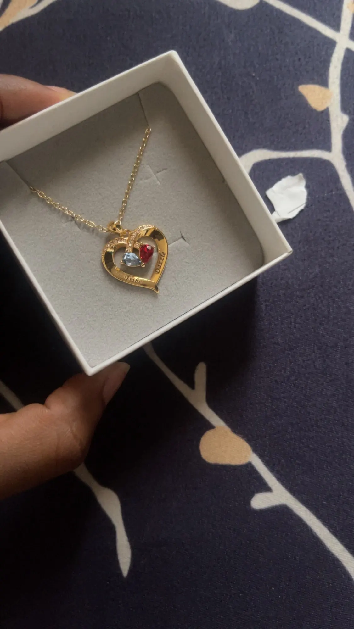 This personalised heart necklace celebrates life’s most meaningful connections, featuring delicately engraved names and radiant birthstones set in an elegant heart design.