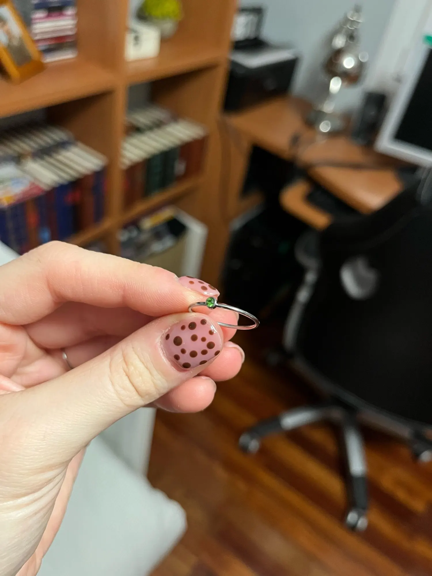 Good fit, nice slim and simple design. The green stone is a bit darker. More black than green.